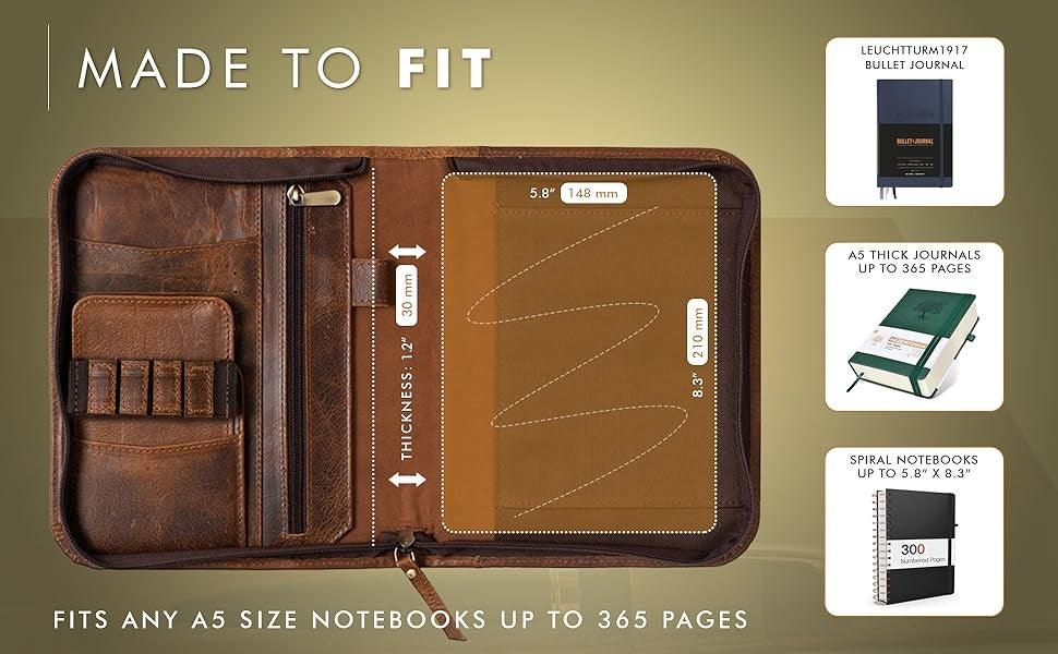 Designed to accommodate both vertical and horizontal notebook layouts, this versatile small portfolio can fit any A5 size notebooks, up to 365 pages thick. Whether you prefer a sleek, compact padfolio or a sophisticated A5 journal cover, this A5 notebook cover delivers.
